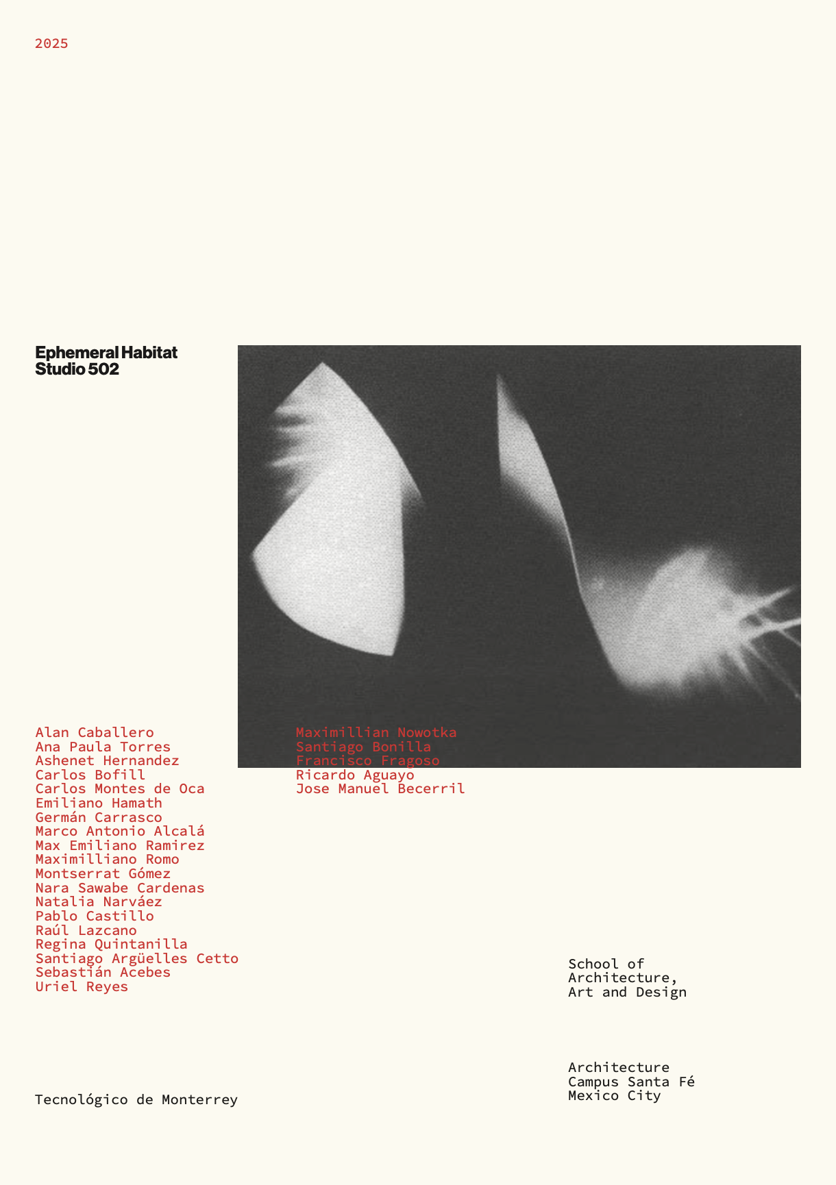 Inspirados por las utopías urbanas de la Ciudad de México, los estudiantes desarrollaron prototipos de infraestructura urbana comunitaria que operan en la escala del barrio y del territorio, entendiendo el hábitat efímero no como lo pasajero, sino como un dispositivo capaz de activar procesos, visibilizar problemáticas y ensayar futuros posibles. El curso se estructuró a partir de metodologías rigurosas que incluyeron el análisis de casos análogos, el estudio profundo del sitio, la lectura de variables topográficas, ambientales y sociales, así como la construcción de planteamientos conceptuales de arquitectura con una fuerte carga crítica.