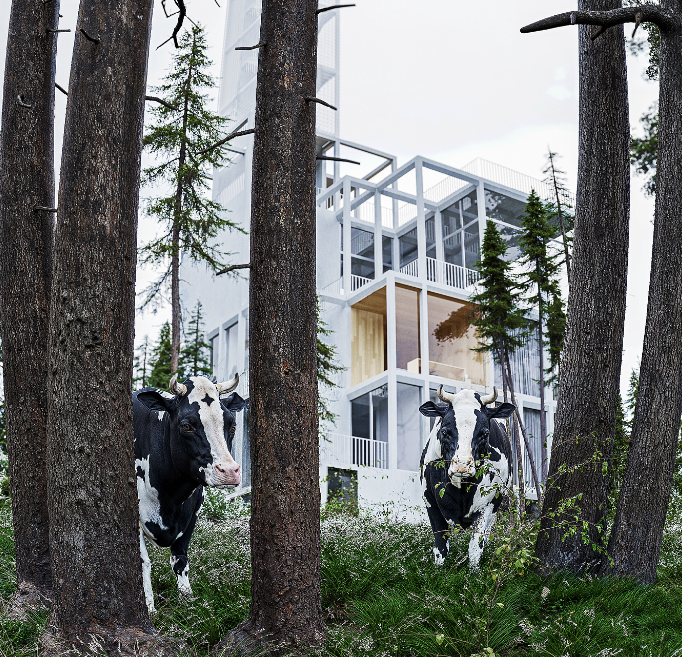 El proyecto se concibe como una arquitectura que se repliega, que busca cobijo en la topografía y se deja abrazar por ella. Su implantación sigue el ritmo natural del terreno, asentándose en capas, como si siempre hubiera estado allí. No hay un volumen único ni un gesto dominante; la construcción se fragmenta y se adapta, diluyendo sus límites en el paisaje montañoso. La arquitectura no se impone a la montaña: la acompaña.
