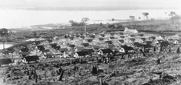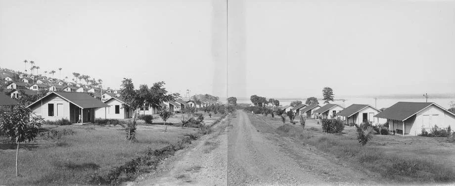 En 1927, Ford se reunió con las autoridades de Pará, en el norte de Brasil, y juntos firmaron un acuerdo que otorgaba a su empresa una extensa franja de tierra a orillas del río Tapajós⁵. Poco después, barcos cargados de materiales y trabajadores comenzaron a surcar los ríos amazónicos, transportando los elementos necesarios para construir Fordlandia. Este asentamiento, que abarcaba más de 110.000 kilómetros cuadrados, una superficie similar a la del Arco Minero del Orinoco en Venezuela⁶, fue concebido no solo para la producción industrial de caucho, sino también como un hogar para los estadounidenses que se trasladaron desde Estados Unidos y para los empleados locales.
